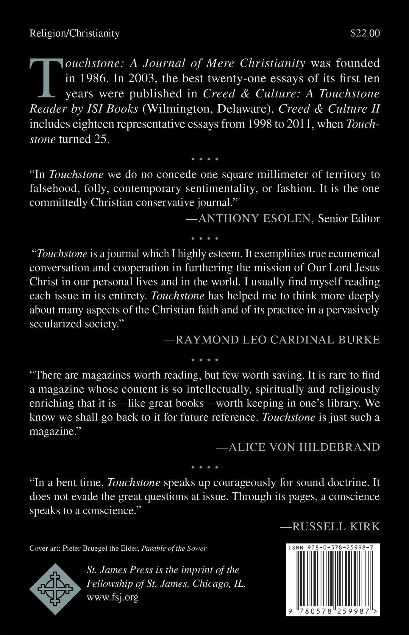 Paperback Edition. Touchstone: A Journal of Mere Christianity was founded in 1986. In 2003, the best twenty-one essays of its first ten years were published in Creed & Culture: A Touchstone Reader by ISI Books (Wilmington, Delaware). Creed & Culture II includes eighteen representative essays from 1998 to 2011, when Touchstone turned 25.